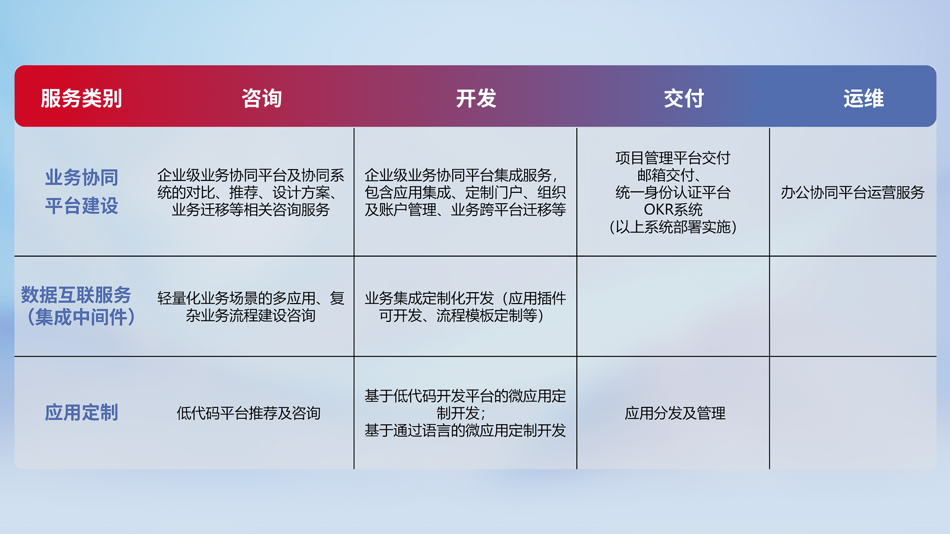 针对钉钉、、、、企微、、IDaas等平台级产品提供产品的规划、、方案、、交付、、、、定制化开发等服务,,实现如统一协同办公、、、智能客户服务、、、混合会议管理、、智能数据查询、、、、等业务场景,,实现数字化转型。。。。