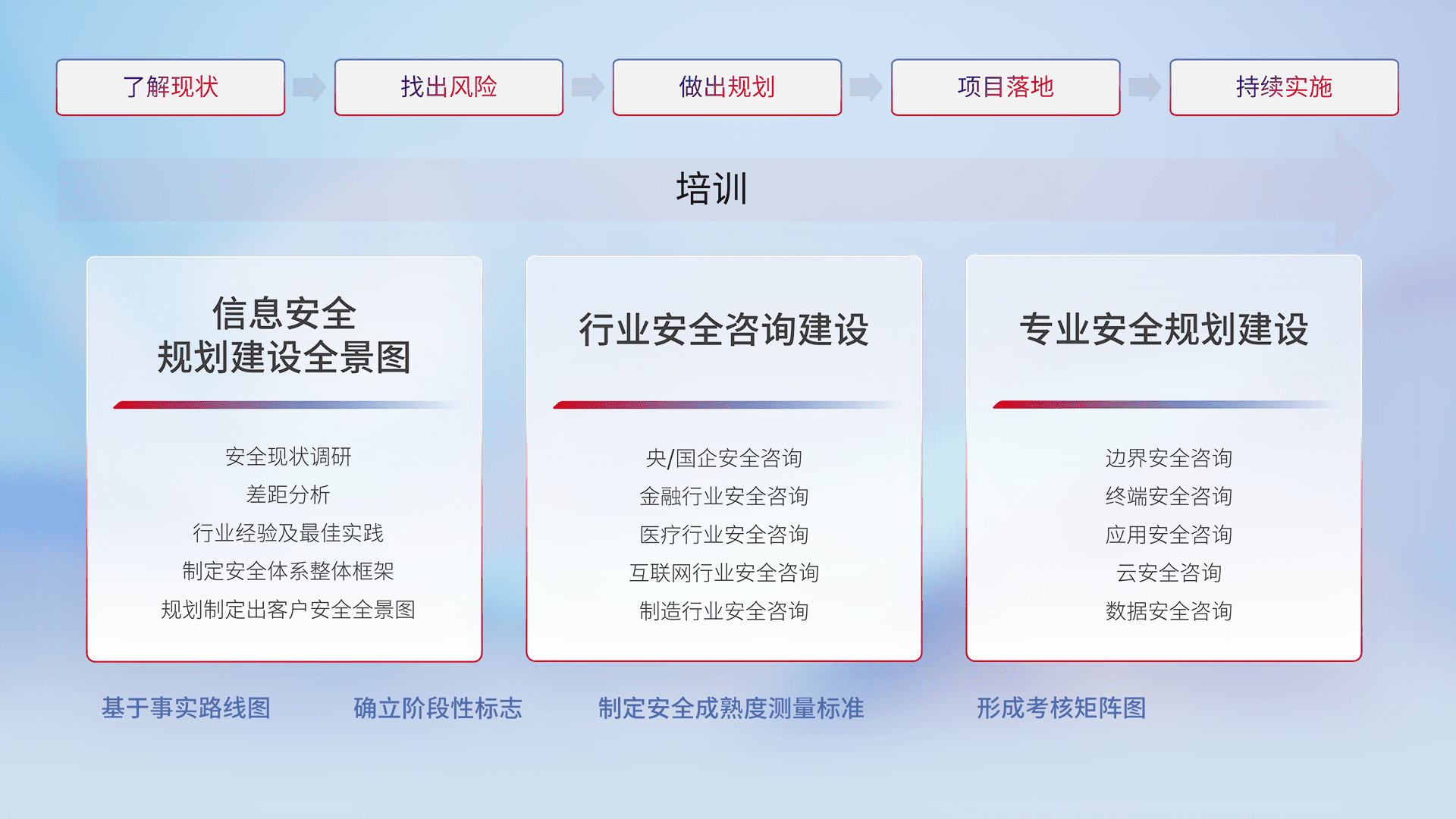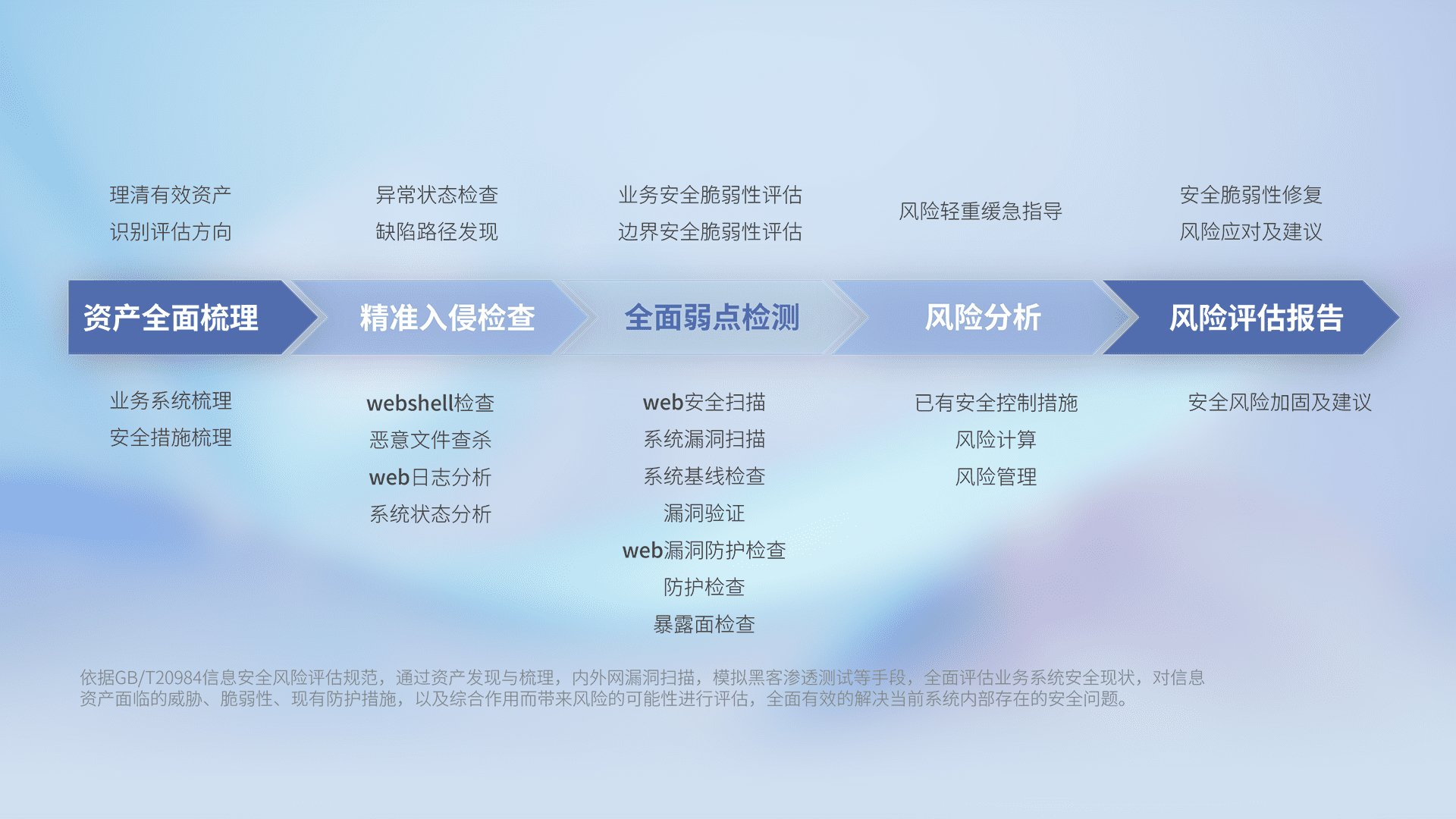 针对客户行业特性,,以专业的安全服务+多厂商联合解决方案提供专属的一站式安全管理服务,,帮助客户全面感知网络空间威胁,,,基于识别、、、、检测、、、、分析、、、、防护、、、监测、、、、响应的服务理论模型,,从方案咨询、、集成交付、、评估验证、、、优化加固、、、运维运营,,致力于为客户提供完整的闭环管理式安全服务。。。。以实战经验为客户打造高抵御风险的安全体系,,,,帮助客户发现威胁、、、对抗威胁、、、处置威胁,,,,不断积累安全对抗能力,,,持续保障数字化安全。。